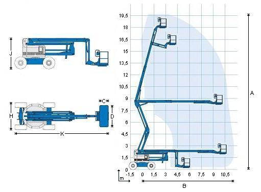 The articulated-telescopic work platform GENIE ZD 20 (Z 60/34) is a mobile lifting equipment that reaches into hard to reach places, using a system of three hydraulically operated telescopic arms with a rotating work cage attached to the so-called JIB arm. The platform is also suitable for working in difficult terrain.