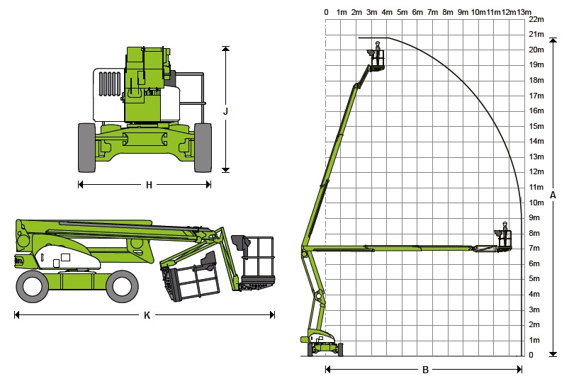 Perfektní přístup do složitě dosažitelných míst je zajištěn třemi hydraulicky ovládanými rameny a košem umístěným na JIB ramenu, kterým je možné pohybovat v úhlu 100 stupňů. Otočnou nástavbou na podvozku lze pohybovat o 360 stupňů. Maximální pracovní dosah je 20,8 metrů do výšky a 12,8 metrů do strany.